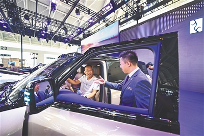 在国家会展中心(天津),消费者在仰望汽车展台咨询了解一款具有智能驾驶功能的汽车。