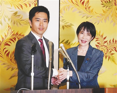10月20日,在位于日本东京的日本国会,日本自民党总裁高市早苗(右)与维新会党首吉村洋文在记者会上握手。新华社/共同社