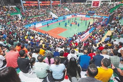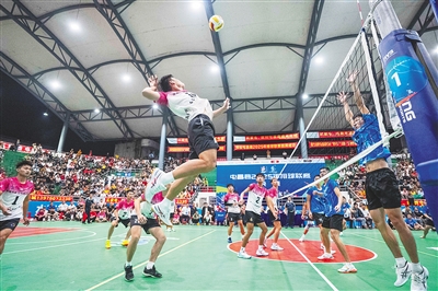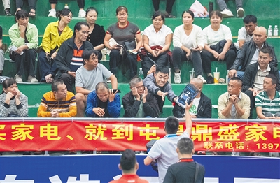 这场“村VA”村味十足。场上主力队员既有在校学生,也有种植户、养殖户等各行各业人员,他们在扣杀与轻巧吊球间随意切换,让人眼花缭乱。观众席上,群众体育的激情与活力满满,除了青年小伙,还有早早入场等候的耄耋老者、带娃的农妇等,大家纷纷为选手呐喊加油。