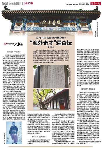 ■ 陈秋如琼台书院是海南最具盛名的书院之一,其历任掌教皆为名儒耆老。林之椿作为琼台书院的末任掌教,自年少时便以文名著称。广东学政汪鸣銮莅临海南按试(官员对考务的监督)时,看到林之椿效仿先贤丘濬《南溟奇甸赋》所撰之文,深为叹赏,誉其为“海外奇才”。中举后的林之椿,曾多次往返于广东与京城之间,洞察时势变迁,遂大力倡行新学,力主教育维新。在林之椿与其他乡贤的共同努力下,琼州教育逐步迈向近代化,为近代书院改制为学堂、学校作出重要贡献。