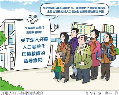 新华社北京10月27日电(记者朱高祥)记者27日从民政部第四季度例行新闻发布会获悉,为引导全社会正确认识人口老龄化带来的机遇和挑战,坚定信心、凝聚共识,民政部等22部门近日联合印发《关于深入开展人口老龄化国情教育的指导意见》,意见共6方面内容,明确了开展人口老龄化国情教育的阶段性目标。“人口老龄化是我国今后较长一段时期的基本国情,开展人口老龄化国情教育是实施积极应对人口老龄化国家战略的基础性工程。”民政部老龄工作司副司长张晓峰在发布会上表示,意见明确了人口老龄化国情教育的主要任务和推进措施,“推动到2035年积极老龄观、健康老龄化理念普遍形成,全社会积极应对人口老龄化的思想基础更加牢固。”