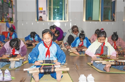 五指山市水满中心学校学生在织黎锦。海南日报全媒体记者 李天平 摄