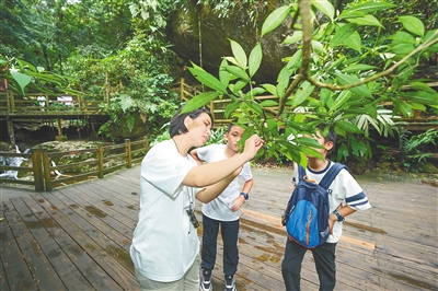 ③ 来自上海的研学旅行团走进五指山市水满乡的热带雨林。