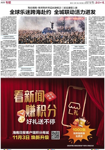 “既看到了喜欢的歌手,又享受了海岛度假,很开心的一趟旅程。”来自韩国的乐迷朴智勋拿着演唱会票根,在三亚国际免税城兑换了无门槛购物券后兴奋地说。依托海南更便利的入境免签政策和丰富的旅游资源,特拉维斯·斯科特演唱会成功打造“观演+度假+购物”一站式国际消费场景,让三亚成为全球Z世代心中的“潮流打卡地”。