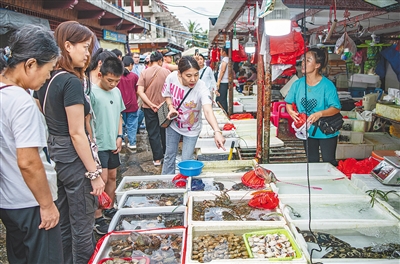 琼海潭门港旁的大排档,食客在挑选海鲜。特约记者 蒙钟德 摄