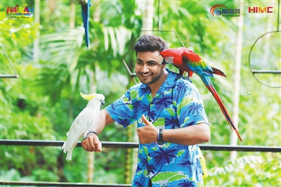 来自巴西的国际推荐官文强在景区和鹦鹉互动。