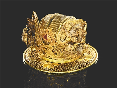 以双龙戏珠梁冠为例,这件明代梁冠以双龙戏珠图案为主题,龙首与火珠通过弹簧连接冠体,行走时随之颤动,灵动非凡。冠上饰以莲花、蝙蝠等吉祥纹样,展现了明代金器工艺的精细与富丽。