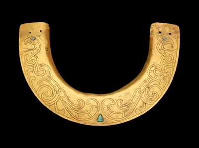 步入展览的第一单元“兴起:草原与早期中国”,一件公元前4世纪到公元前3世纪的璜形项饰静静陈列,其独特的造型立刻将观众的思绪引向广阔的欧亚草原。这是黄金工艺从大陆西端向东传播的早期物证。