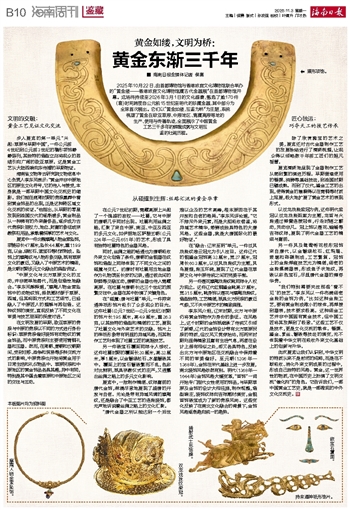 海南省文物考古研究院文物信息中心负责人李东风表示:“黄金并非中原地区的原生文化符号,它的传入与接受,本身就是一部早期中国文化交流史的缩影。我们能在商周时期的贵族墓葬中看到黄金饰品的出现,正是这种跨区域文化交流的实证。”他指出,从早期的零星发现到战国汉代的逐渐增多,黄金制品从一种稀有的外来奢侈品,逐步成为古代贵族阶层权力、地位、财富的象征或宗教祭祀用品,承载着深厚的艺术与文化。