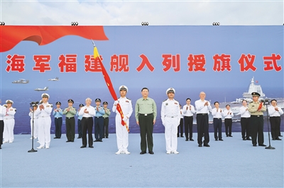 新华社三亚11月7日电(记者梅常伟)我国第一艘电磁弹射型航空母舰福建舰入列授旗仪式5日在海南三亚某军港举行。中共中央总书记、国家主席、中央军委主席习近平出席入列授旗仪式并登舰视察。十一月的三亚,海阔天高,碧波浩瀚。军港内,福建舰踏海而立、满旗高悬,山东舰伏波相伴,来自海军部队和航母建设单位的代表2000余人在码头整齐列队,气氛隆重热烈。