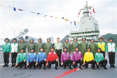 11月5日,我国第一艘电磁弹射型航空母舰福建舰入列授旗仪式在海南三亚某军港举行。中共中央总书记、国家主席、中央军委主席习近平出席入列授旗仪式并登舰视察。这是习近平同舰载机飞行员、航空保障人员合影留念。