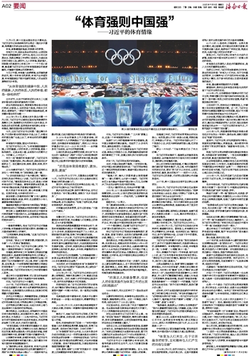 在地方工作,组织全县全民运动会,让老百姓“身体也要健康起来”;到中央,担任2008年北京奥运会、残奥会筹备工作领导小组组长,为盛会成功举办倾注心血;新时代,从人民幸福、国家强大、民族复兴的高度关心体育工作……一个个动人故事,彰显着习近平总书记对体育强国建设的高度重视、对健康中国事业的深厚情怀。