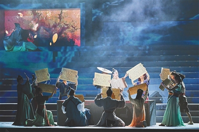 11月8日晚,在第三届中国(海南)东坡文化旅游大会开幕式上,中国首部AI概念国风音乐剧《心安东坡》隆重首演。这场融合东坡文化精髓、海南本土风情与现代科技的艺术盛宴,吸引了近千名文化学者、艺术爱好者及“坡粉”现场观演。图为音乐剧演出现场。