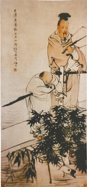 近代画家任伯年的《羲之爱鹅图》立轴,纸本设色,纵136.2厘米,横66.7厘米,现收藏于北京故宫博物院。从画面看,水面清澈,波光粼粼。一桥架于水面,有绿植依附桥间,桥下几只大白鹅正在欢快地嬉水。此时,王羲之与一书童一起立于桥上,王羲之儒冠长袍,一手持扇,一手扶在桥栏上,眼睛凝视水面上的几只白鹅,观看鹅子嬉水的各种形态,若有所思。身旁的书童也随主人正在观看水面上这几只鹅子,神态自然。