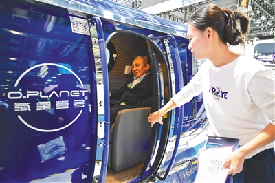 在第八届进博会医疗器械及医药保健展区,一名观众体验一款适用于中老年群体的家用高氧舱。新华社发