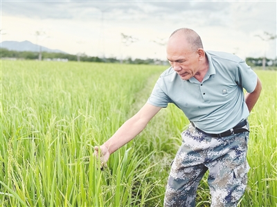 王义生查看水稻长势。本版图片除署名外均由刘阳秀摄