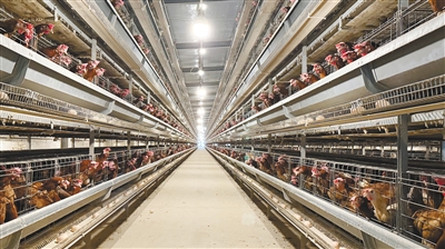 走进鸡舍,记者看到几排5层高的“楼房”整齐排列,每间“房”住着五六只鸡。在自动投喂、智能收蛋和调温等现代化养殖设备运作下,这里的鸡过上了“饭来张口”的舒适生活。