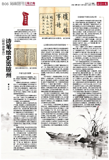 ■ 杨江波《琼州杂事诗》是清代学者、诗人程秉钊撰写的海南风土杂记,成书于清光绪十三年(1887年)。这一古籍以诗歌加附注的形式记录了海南岛从汉代至明清时期的重大历史事件与人物,兼具史料性与文学性,读来颇有趣味。