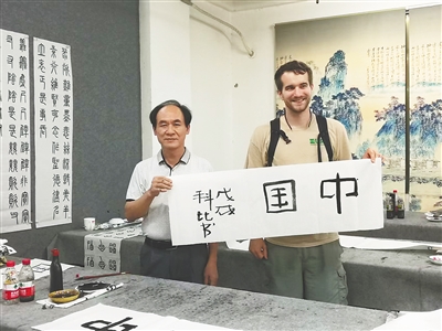 周始照与来访的外国人交流书法。