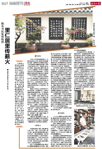 在周始照看来,“书法史本身即历史的一部分”,其创作从来都与深厚的人文历史息息相关。正因如此,他积极参与陵水古街的改造和修复工作以及陵水廖纪文化研究和挖掘等各类活动,为发掘、整理、弘扬家乡文化而奔走努力,将书画院内的艺术探索,与对脚下这片土地的深情紧密结合。