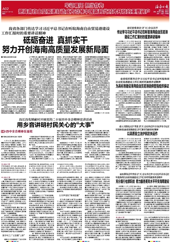 连日来,我省各部门传达学习习近平总书记在听取海南自由贸易港建设工作汇报时的重要讲话精神,以及省委常委会(扩大)会议精神。大家一致表示,将认真学习、深刻领会习近平总书记重要讲话精神,立足岗位实际,勇于担当作为,敢于开拓创新,切实把学习成果转化为谋发展、抓落实的具体举措,努力开创海南高质量发展新局面。