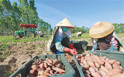 村民在儋州南岸村的海头地瓜种植基地里捡拾地瓜。资料图
