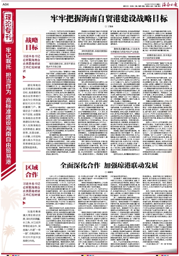 建设海南自由贸易港的战略目标,就是要把海南自由贸易港打造成为引领我国新时代对外开放的重要门户。要锚定这个战略目标不动摇,全面落实海南自由贸易港建设总体方案,深入实施海南自由贸易港法,解放思想、改革创新,分步骤、分阶段构建与高水平自由贸易港相适应的政策制度体系。