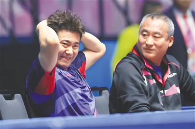 11月11日,河北队选手梁靖崑(左)在休息时与教练交流。 新华社发