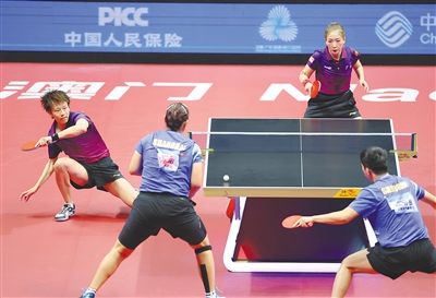 11月11日,广东队组合林高远(左一)/刘诗雯(右二)与上海队组合赵钊彦/孙铭阳在比赛中。 新华社发
