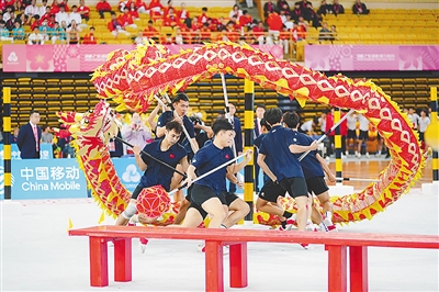 第十五届全运会首次将舞龙舞狮列入群众展演项目,赛事设南狮自选、南狮障碍、南狮传统、舞龙障碍、北狮自选、舞龙规定、舞龙自选、彩带龙自选8个单元,为观众带来了精彩的龙狮盛宴。