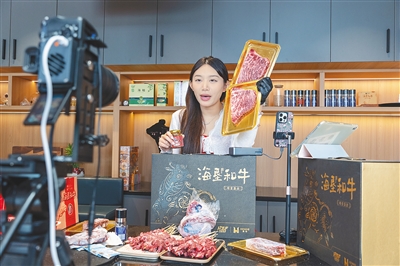 海垦和牛雪花牛肉旗舰店开设“海垦和牛”抖音直播间,吸引全国各地的顾客购买。图为主播在推介产品。海南日报全媒体记者 袁琛 摄