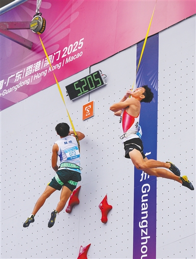 本报讯(海南日报全媒体记者王黎刚)11月13日中午,第十五届全国运动会攀岩项目男子速度预赛在广州结束。海南队选手林雨发挥正常,攀出5秒20的成绩,名列第12名,赢得了参加14日举行的决赛的资格。比赛采用计时赛制,选手们须在规定的时间内争取最快到达终点,给观众带来了紧张刺激的视觉享受。赛事进行得非常激烈,前三名选手成绩均在5秒以内。贵州选手龙见国以4秒85的成绩排名预赛第一。林雨精准的动作与稳定的节奏,也赢得了现场观众的热烈掌声。海南队的另外一名选手谢芳耀排名靠后,没能进入前16名。
