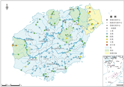 全省地表水水质总体为优,191个1省控监测断面(点位)的水质优良(Ⅰ~Ⅲ类)比例为92.7%,同比上升0.6个百分点;劣Ⅴ类比例为0.5%,同比持平。18个市县(不含三沙市)中,文昌市水质轻度污染,海口市、东方市、临高县和屯昌县水质良好,其余市县水质为优。