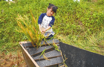 近日,五指山市牙胡梯田景区核心区1400多亩稻田进入成熟期。11月15日,五指山市毛阳镇2025年晚造开镰活动在该景区启幕,当天吸引了500余名游客齐聚梯田,共赏金色稻浪。图①为俯瞰换上了金黄盛装的牙胡梯田。图②为游客小朋友在体验打稻谷。