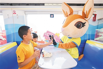 在开往乐东方向的三乐列车车厢内,三亚亚沙会吉祥物“亚亚”跟小朋友互动玩耍。