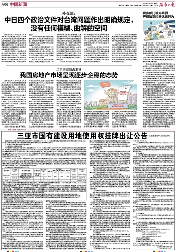 毛宁说,1972年,《中日联合声明》签订,两国正式建立外交关系。联合声明共有三处涉及台湾问题,一是在前言部分写明,“日本方面重申站在充分理解中华人民共和国政府提出的‘复交三原则’的立场上,谋求实现日中邦交正常化这一见解”;二是在声明第二条写明,“日本国政府承认中华人民共和国政府是中国的唯一合法政府”;三是在声明第三条写明,“中华人民共和国政府重申:台湾是中华人民共和国领土不可分割的一部分。日本国政府充分理解和尊重中国政府的这一立场,并坚持遵循波茨坦公告第八条的立场”。
