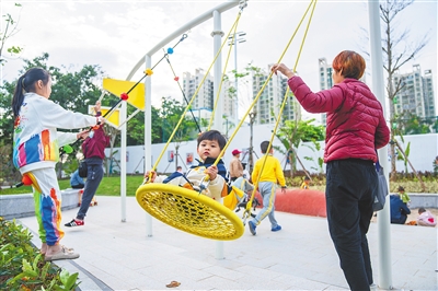 11月19日,海口市椰海大道与新大洲大道交叉口的椰新园,小朋友正在荡秋千。这座新近开放的“口袋公园”有多种健身和游乐设施,成了周边居民休闲锻炼的好去处。