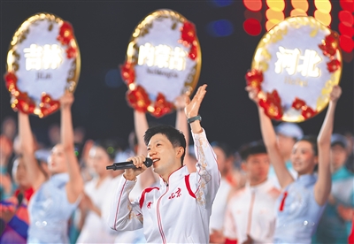 在欢快热烈的气氛中,各参赛代表团代表入场。全体起立,高唱中华人民共和国国歌。