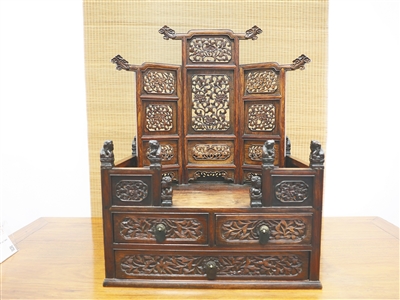 黄花梨三屏式透雕花草纹镜台。