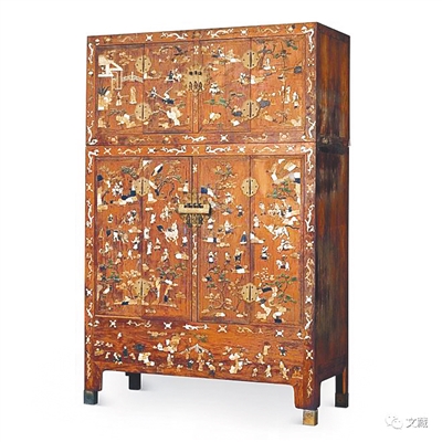 明代花梨木嵌螺钿玉石人物图顶竖柜。