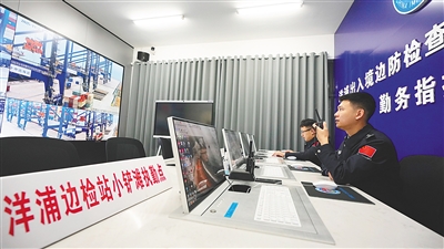 11月23日,在洋浦国际集装箱码头,洋浦边检站民警在勤务指挥室值班,实时关注口岸动态。据悉,为服务海南自贸港封关运作,洋浦边检站优化办检流程,实行7×24小时通关服务保障,创新推出“无感通关”“证件联办”等服务模式,保障船舶靠港“零等待”、离港“零延时”。图/文 海南日报全媒体记者 张茂 通讯员 吴岳