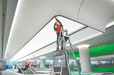 11月25日,三亚凤凰国际机场三期项目T3航站楼施工现场,工人们对灯光设备进行安装调试。据悉,该航站楼已通过地方竣工验收,目前正进行组装安检设备、清洁室内环境以及屋面板安装等收尾工作。同时,凤凰机场正在开展各项演练工作,为民航工程竣工验收及最后的行业验收做准备。
