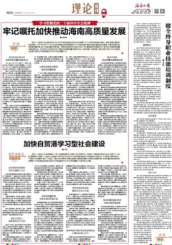 党的二十届四中全会通过的《中共中央关于制定国民经济和社会发展第十五个五年规划的建议》提出,“健全终身职业技能培训制度”,为“十五五”期间职业技能培训工作指明了方向。在全力推进海南自由贸易港建设、奋力谱写中国式现代化海南篇章的关键时期,我们要加快构建与海南自贸港建设相匹配的终身职业技能培训制度,塑造素质优良、总量充裕、结构优化、分布合理的现代化人力资源。