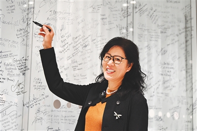 郎平颁奖仪式后在签名墙上签名。新华社发