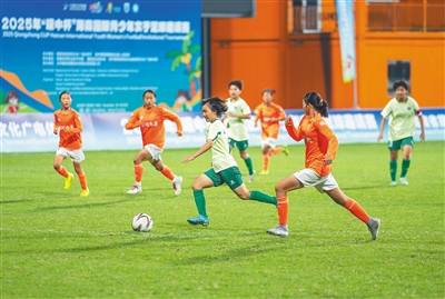 参赛队伍分别来自琼中女足、俄罗斯哈巴SKA协会、衡阳体校、萍乡市体校、杭州足管中心、江苏盐城市、北京大兴、内蒙古呼和浩特足球运动中心。图为琼中女足的队员突破对方防守。海南日报全媒体记者 李天平 摄