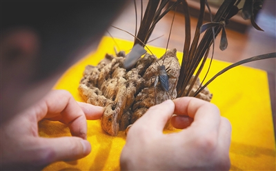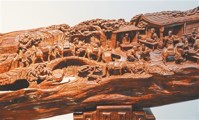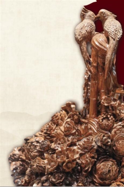 胡敬阳创作的木雕作品《祝福祖国花篮》,采用海黄精心制作而成。