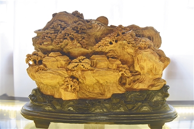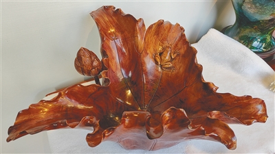 海南黄花梨树根腐木雕刻成的花盆。受访者供图