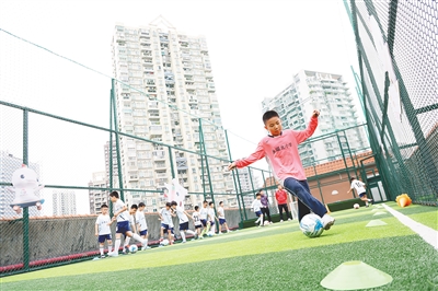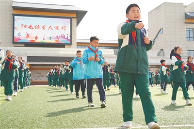 在西安市曲江第六小学,学生在阳光体育大课间活动上练习少儿自编版八段锦。新华社发