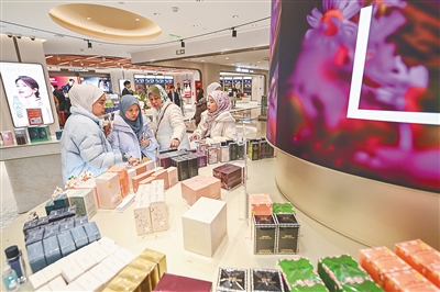 图为来自马来西亚的游客在西安市内免税店免税商品区选购香水。新华社发