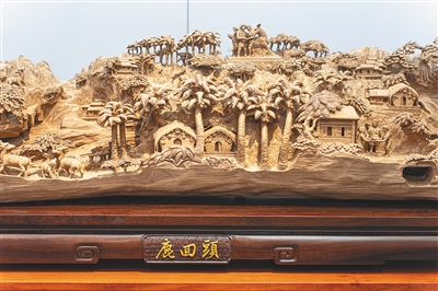 11月27日,在天香国色·第二届海南沉香黄花梨国际交易会上,展示首届大国非遗工匠、国家高级技师胡敬阳木雕作品《鹿回头》。